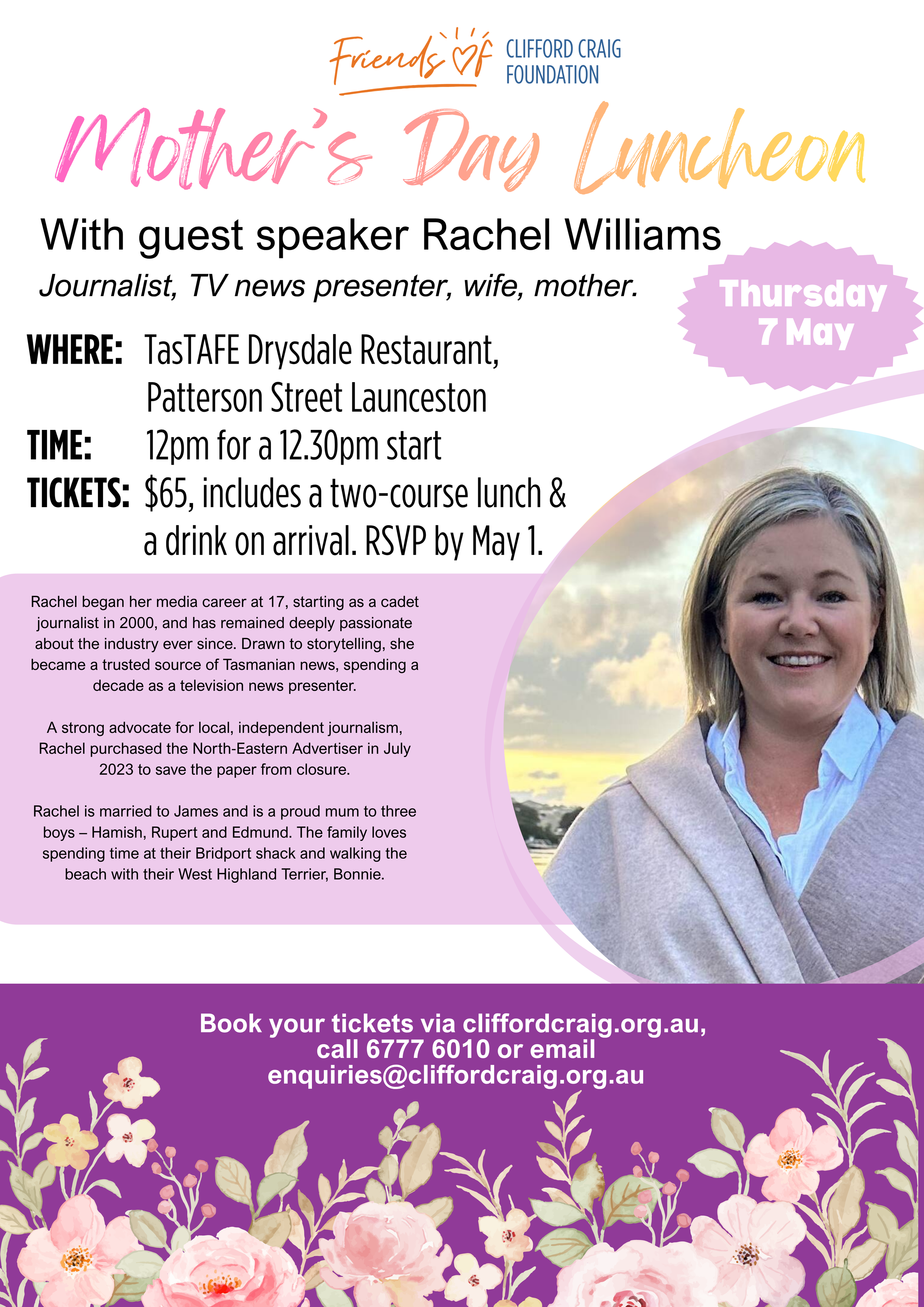 To Purchase Tickets for the Upcoming Friends of Clifford Craig Mother’s Day Luncheon Follow this link Eventbrite Tickets or call the office on 03 6777 6010